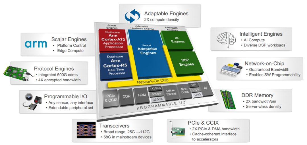 • 2019年,FPGA全球市场已经超过60亿美金,而FPGA也从最开始的仅应用于胶合逻辑发展成为高度集成的多核异构计算平台,广泛于医疗,工业,军事,通信等各类应用领域。Xilinx最新发布的Versal ACAP采用7nm工艺,配备双核 Arm® Cortex®-A72 应用处理器、双核 Arm Cortex-R5F 实时处理器、超过 200 万个逻辑单元的自适应硬件以及 3,000 多个为高精度浮点与低时延优化的 DSP 引擎。Versal AI Core 器件提供多达 400 个专为 AI 推断和高级信号处理工作负载优化的 AI 引擎。