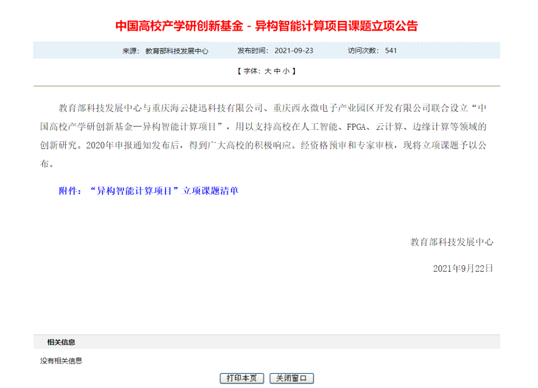 教育部科技发展中心与重庆海云捷迅科技有限公司、重庆西永微电子产业园区开发有限公司联合设立“中国高校产学研创新基金—异构智能计算项目”,用以支持高校在人工智能、FPGA、云计算、边缘计算等领域的创新研究。