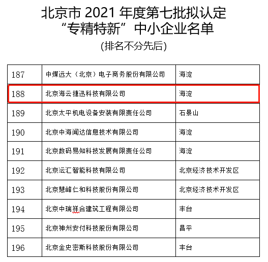 海云捷迅入选北京市 2021 年度第七批拟认定“专精特新”中小企业名单。