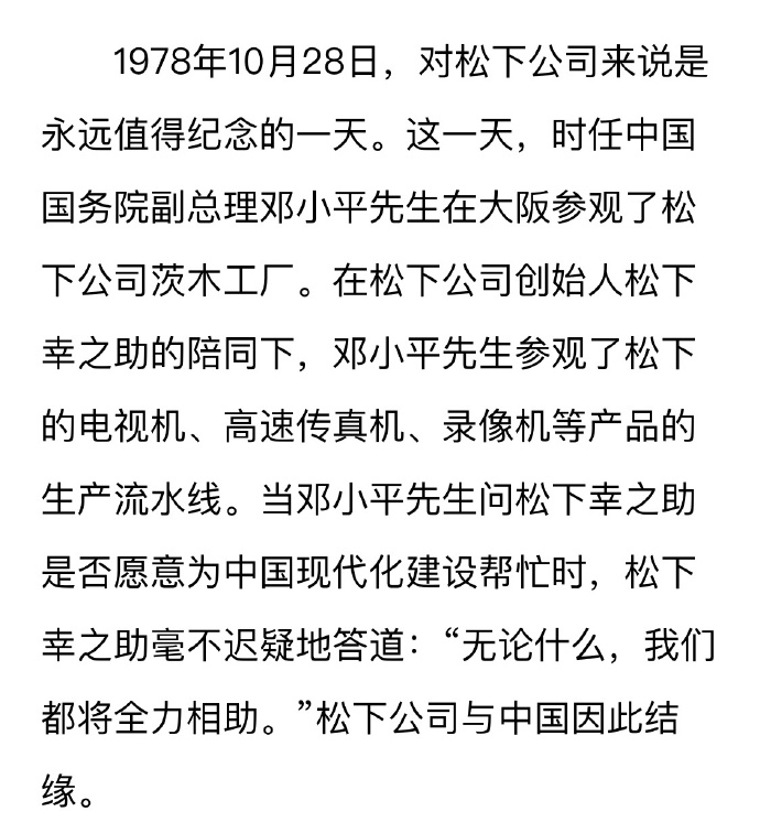 1978年邓老访日。在访问松下公司总部的时候,对已经80多高龄的松下幸之助老先生坦言:“今后我们要搞现代化了,准备吸收外国的技术和资金。松下先生,你能否为中国的现代化建设帮点忙?”