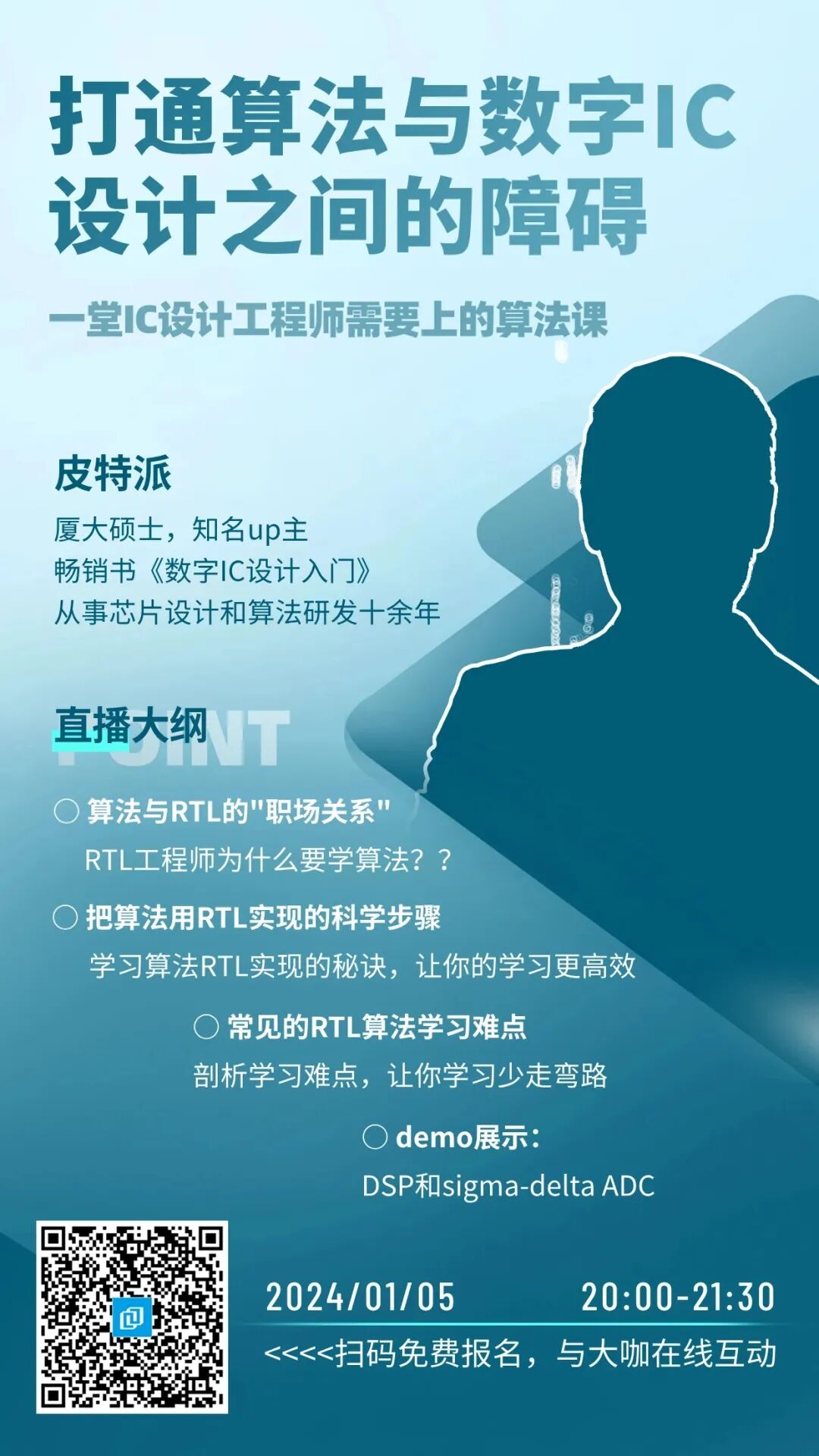 详解算法在RTL实现中的逻辑思维,解读其中的精髓。此外,皮特派老师会分享一些在实际应用中需要注意的关键点,帮助大家在数字IC设计中更好地运用算法。
