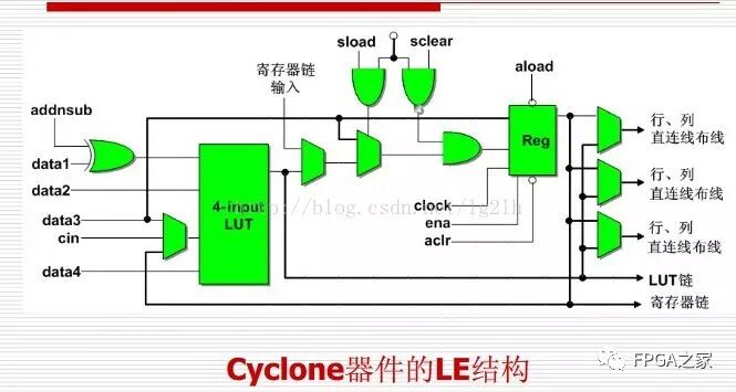 一个逻辑单元包含3个输出,两个用于驱动行连接、列连接、直接连接,另外一个用于驱动本地互联。这三个输出是相互独立的。输出信号可以来自于查询表也可以来自于寄存器。一个LE主要由两部分组成:查找表LUT+可编程寄存器