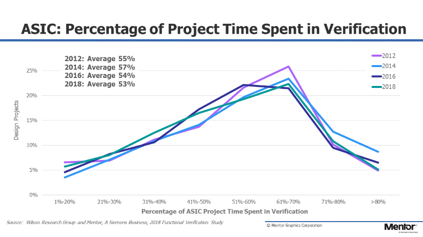 再来简单说一下验证。之前的文章里提到过,验证是一个非常复杂的领域。比如在下面的这张Mentor的图片里就显示,在一个芯片项目里,平均而言至少会有超过一半的时间花在验证上,有的甚至占60%~70%。以我自己的经验来说,这个比例会更高。