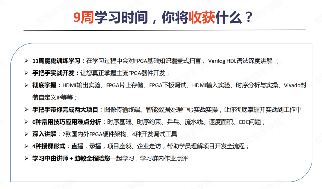 这套课程也比较适合从事FPGA开发0~3年经验的电子新手,在这套课程里,老师会手把手带你进行11周的魔鬼式学习+项目训练。在学习过程中,会带领大家对FPGA基础知识进行覆盖式扫盲,从FPGA底层硬件、EDA工具、Verilog语言、ZYNQ裸机、ZYNQ Linux搭建、项目实战等,通过2大FPGA硬件架构(Gowin GW1N、Xilinx ZYNQ)4大开发调试工具(Gowin、Vivado、Modelsim、Blue Pearl)让你轻松掌握各类FPGA开发理论与实战技能。