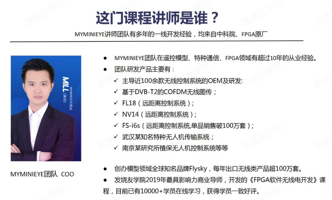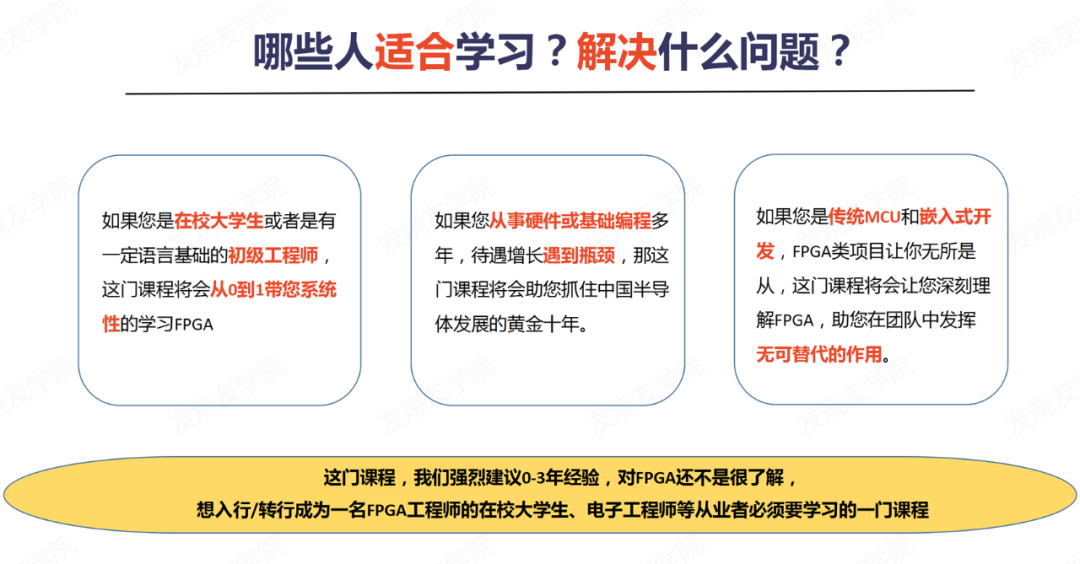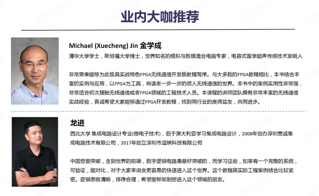 做这套课程的目的,就是希望能够帮助已从事硬件设计、传统MCU、嵌入式开发的工程师,想要从事FPGA通信、芯片设计开发的朋友们,增加自己的职场竞争力,提高自己的职业天花板,最终赢得高薪职位,当然也算给芯片国产化之路贡献自己的一份力量!