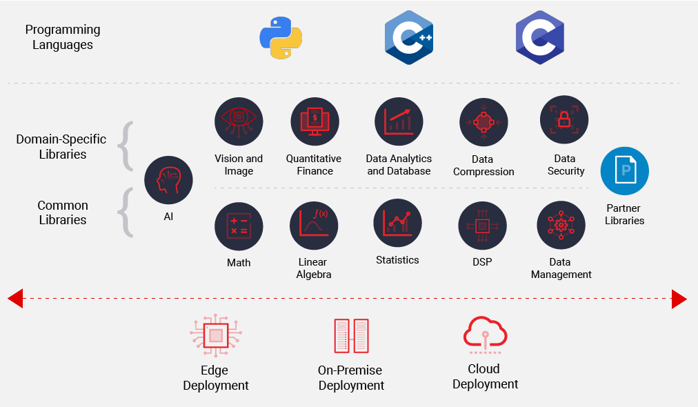 在核心开发工具包之上,就是所谓的硬件加速库。它由针对不同应用领域的8个子库组成,分别应对AI、视频编解码、视觉与图像处理、数据分析、金融量化、基础线性代数计算、求解器、以及数据库操作。这八个子库总共包含400多个预先优化的开源应用,能极大的减轻这些领域应用开发的难度、降低开发时间。