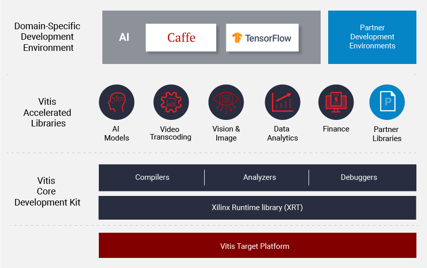 Vitis并没有强制开发者使用固定的IDE,与之相反,它可以被插入到很多常见的软件开发工具和框架中,并依靠一系列硬件加速库库连接底层的赛灵思的生态系统。