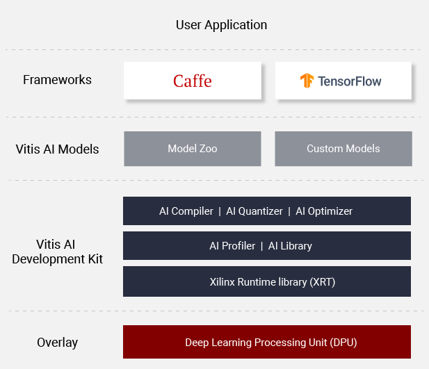 在Vitis顶层,则是针对特定领域(domain specific)的开发环境。以AI为例,它支持TensorFlow、PyTorch和Caffe等标准AI框架,并提供了一些预先训练和优化过的AI模型。