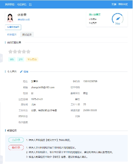 通常HR在筛选简历的时候,需要根据业务部门的要求进行比对,结合对候选人基本信息进行判断选择。由于业务方向多、人工核查不仅费时费力,还有极大可能漏掉很多优质人才,因此想选择好的人才,重要的一点就是通过智能化手段,快速精准的锁定人才。致远互联薪事力人力云支持超过200+解析字段,可以快速解读简历信息,通过详细的简历解析,对候选人的亮点和疑点进行准确分析,快锁帮助HR锁定优质人才,高效的匹配最优候选人,从招人的源头保障人才质量。
