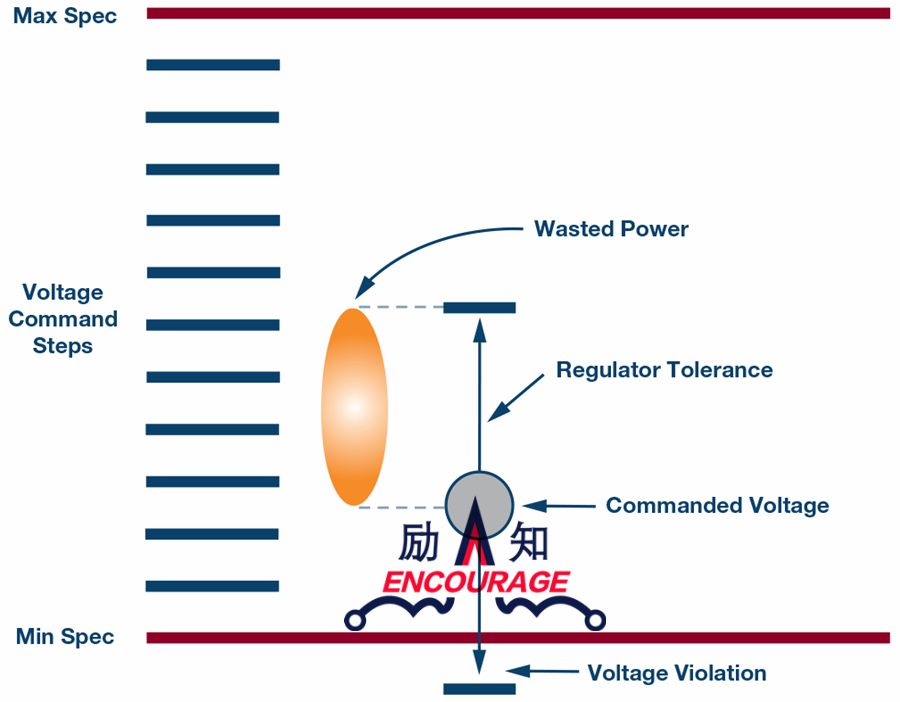 这种优化过程需要非常精确的电源才能获得成功。必须将调节器误差纳入误差预算,并从可用于优化的可用电压范围中减去。如果内核电压降至要求电压以下,则FPGA可能因时序错误而发生故障。如果内核电压漂移至最大规格值以上,结果可能会损坏FPGA,或者可能会在逻辑中形成保持时间故障。为了防止所有这些情况,必须考虑电源容差范围,并且指令电压必须保持在规格限值以内。问题是大多数电源调节器都不够准确。调节电压可能是指令电压容差范围内的任何电压,可能随负载条件、温度和老化而漂移。保证±2%容差的电源可以在4%的电压窗口内任意调节电压。为了补偿电压可能比下限值低2%的问题,必须将指令电压提高到比时序要求2%的水平。如果调节器然后漂移到比指令电压高2%的水平,它将在比该工作点所需的最小电压高4%的水平运行。这仍然符合FPGA的指定电压要求,但却浪费了大量功率(图2)。