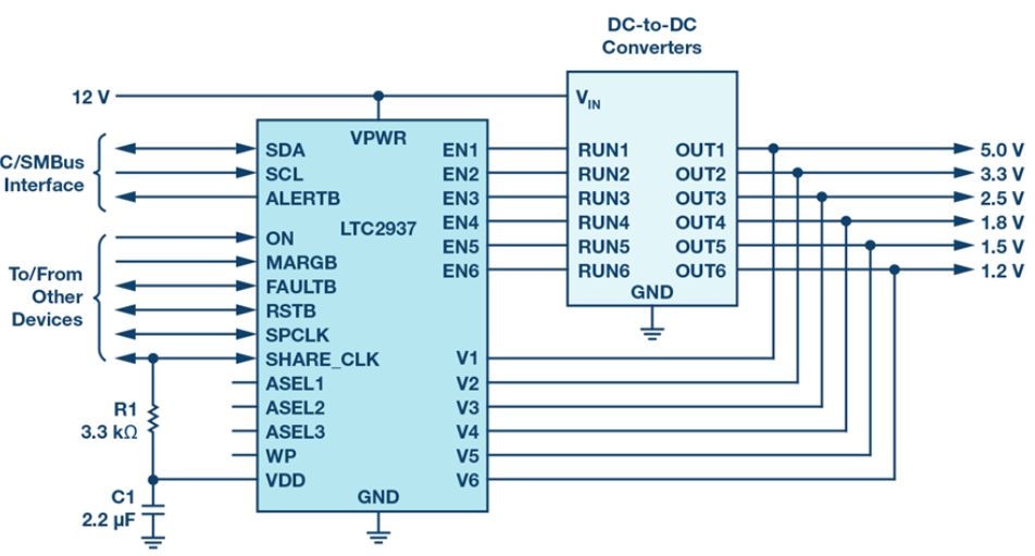 LTC2937属于带EEPROM的可编程序列器和监控器。该器件具有全面的数字可编程能力,拥有基于时间和基于事件的定序功能,可以对任意数量的电源进行定序和监控,还能把故障状态记录到EEPROM黑匣子当中。对于不需要电压管理和遥测功能的应用,这种解决方案有很大的价值。Power System ManagementTo fully capture all of the benefits of complete PSM, use one of the Analog Devices PSM ICs. These introduce the ability to autonomously sequence up and down any number of power rails; accurately control rail voltages to better than 0.5% (or 0.25% in some cases); measure and report voltage, current, temperature, and status telemetry; cooperatively handle complex fault scenarios; and record detailed fault information to EEPROM.Sequencing is done by a system of timing handshaking, with all ICs agreeing on time zero and the time base, and all sequence events happening at preprogrammed times (time-based sequencing). This allows any number of rails to sequence up and sequence down autonomously.The family of PSM ICs includes controllers that have their own switch drivers and analog loop control to handle the switching power supply in all aspects. Alternatively, power supply managers contain a servo loop that wraps around an external power supply, adding all of the features of power supply management, including sequencing, supervision, and monitoring, to any power rail, from switching power regulators to LDO regulators. An example of a power supply manager is the LTC2975, pictured in Figure 10.