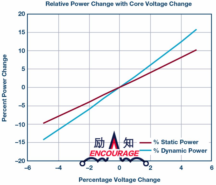 注意标有"SmartVID"的行,其电压范围为0.82 V至0.93 V。这表示,当FPGA通过SmartVID 2接口(详见后文)请求自身的内核电压时,FPGA可以接受的各种电压。该SmartVID规格表明了有关FPGA的一个基本事实:FPGA可以在不同电压下运行,具体取决于其特定的制造容差以及采用的特定逻辑设计。FPGA的静态电压可能各不相同。电源必须具备响应和适应能力。设计目标是产生恰好能满足编程功能需求的性能水平,不消耗不必要的功率。根据半导体的物理特性以及Altera、Xilinx®(图1)和其他公司公布的数据可知,动态和静态功率会随着内核V DD的增加而显著提高,因此我们的目标是确保,给FPGA提供的电压刚好达到其时序要求即可。功耗过大无助于提高性能。实际上,功耗过多会使情况变得更糟,因为晶体管泄漏电流随着温度的升高而增加,从而消耗更多不必要的功率。由于这些原因,当务之急是优化设计和工作点的电压。