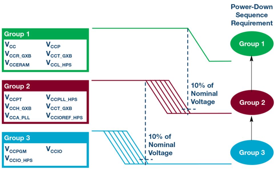 共享定序PSM微型模块、管理器IC和控制器IC全力协调,通过简单的单线总线SHARE_CLK共享时序信息,从而实现上下定序。通过该单线,所有PSM IC共享各种信息,比如定序何时开始(零时)、时钟每次何时走时以及影响定序的其他状态信息。只需将系统中的所有SHARE_CLK引脚连接在一起即可实现这种协调。每个IC都有自己的序列时序编程功能,可以使用共享时基精确可靠地对事件(如使能和禁用、斜坡和发生故障时的超时)计时。基本而言,SHARE_CLK引脚是一个开漏100 kHz时钟引脚。开漏意味着IC可以主动下拉或释放,并允许总线浮动。当总线上的所有器件都释放时,上拉电阻会将电压拉至3.3 V。这样,一个器件就可以通过下拉停止时钟,直到时钟准备就绪;这意味着所有器件必须在时钟启动之前达成一致:这是一种有效的零时信息传递机制,也是通过停止时钟来指示定序状态的一种有效机制。共享故障处理与SHARE_CLK引脚类似的是FAULT总线。系统中的每个PSM IC都连接到共享FAULT线,既可使用其开漏输出将其拉低,也可以在另一个器件拉低时进行响应。这为整个PSM器件系列提供了一种简单、快速的故障传递和响应方式。该行为完全可配置,并且在出现问题时,无论是在定序期间还是在稳定状态期间都支持协调响应。可以将系统配置为移除电源并尝试根据指定的时序重新定序,同时在黑匣子中记录有关系统状态的信息,并在发生故障时记录故障原因。该EEPROM黑匣子信息可通过I2C总线进行后续处理。降序定序和存储能量管理对电源进行降序定序时还要考虑一个额外因素:能源管理。越来越重要的是要在电源降序定序时为其提供确定的时序,这就需要仔细考虑系统哪些地方会消耗存储的能量。高功率电源可能有许多大型电解电容作为大容量电荷存储元件,并且这些电容会被充电,达到电源电压,其中保存着足够的能量,在不幸的条件下有可能炸毁未采取正确防护措施的器件。为了避免这种情况,FPGA制造商指定了用于保护器件的降序序列。对于Altera Arria 10,该序列如图12所示。