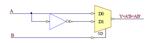 假设输入信号为 A、B,输出信号为 Y=A’B+AB’。则用一个二选一 mux和一个 inv 实现异或的电路如下图所示: