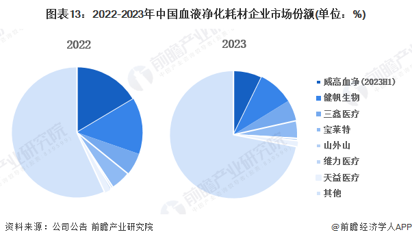 从市场份额来看,威高血净、健帆生物占据我国血液净化耗材较高市场份额。2022年,威高血净血液净化耗材市场份额约达16%,位居第一;健帆生物市场份额约达14%,位居第二。