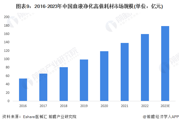 老龄化的趋势下,尿毒症患者数量将持续增长。目前中国存量血液净化治疗需求仍远未被满足。随着人均收入的增长及医保覆盖比例的增加,新型血液净化技术与产品的研发水平、产业化程度不断提升,终末期肾病患者接受治疗比率不断提高,血液净化类高值耗材市场规模将进一步增长。据Eshare医械汇测算,2022年中国血液净化类高值医用耗材市场规模约为160亿元。2023年,中国血液净化类高值耗材市场规模约达180亿元。