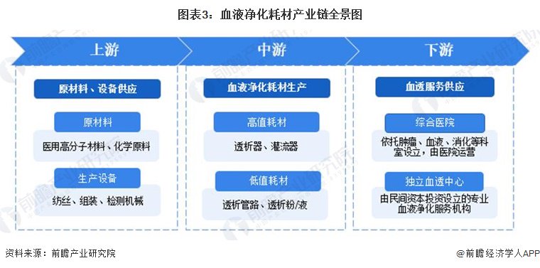 血液净化耗材产业链上游环节包括血液净化耗材的原材料及设备供应;行业中游为血液净化耗材生产制造,按照血液净化耗材细分产品的价值,中游细分产品包括透析器、灌流器等高值耗材以及相较于前者价值较低的透析管路、透析粉/液等低值耗材;行业下游为血液净化耗材的销售终端,主要包括综合医院和独立血透中心。