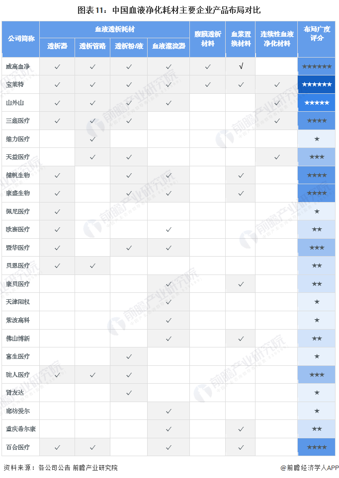 ——布局强度:威高血净、健帆生物规模领先