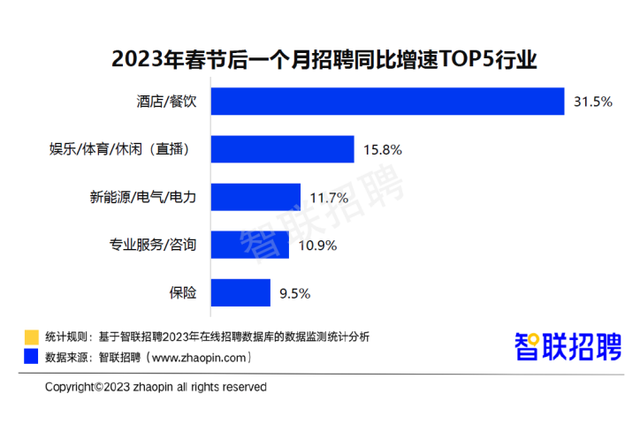 数据显示,春节后一个月,酒店/餐饮行业招聘职位数同比增长31.5%,排名第一。《2023年春招市场行情周报(第四期)》认为,疫情防控政策优化和春节假日经济均刺激线下消费,使相关行业招聘需求增长,促进招聘职位数同比快速提升。直播等新业态的发展,也带动娱乐/体育/休闲行业以15.8%的招聘同比增幅排名第二。“双碳”政策带动新能源行业招聘同比较快增长,节后一个月,新能源/电气/电力行业招聘职位数同比增长11.7%,排名各行业第三。