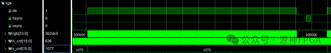 可以看出Hsync和Vsync按照预期在syncstart拉高,持续到syncend拉低。仿真结果符合预期。