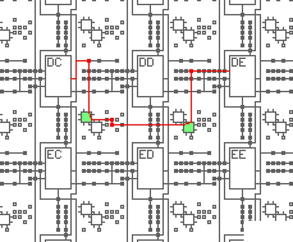 每个CLB都有从AA到HH的字母名称。互连可以将例如块DC的输出连接到块DE的输入,如下所示。红线表示路由路径,红色小方块表示已激活的路由点。离开模块DC后,信号由第一个路由点定向到8针开关(绿色),该信号将其引导到另外两个路由点和另一个8针开关。(未显示未使用的垂直和水平路径。)请注意,布线相当复杂;即使是这条短路径,也使用了四个路由点和两个开关。