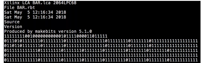 通过位流(具有专有格式的位序列)配置FPGA。如果您查看XC2064的比特流(如下所示),那是令人费解的混合模式,这些模式不规则地重复,并散布在比特流中。XACT中的函数定义与位流中的数据之间没有明确的联系。但是,研究FPGA的物理电路可以揭示比特流数据的结构,并且可以理解。