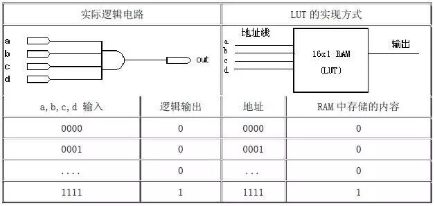 查找表LUT(Look-Up-Table)其本质是一个静态存储器SRAM,目前FPGA多采用4输入的LUT,每个LUT可以看作一个有4位地址线的16x1的RAM。当我们通过原理图或HDL语言描述了一个逻辑电路后,FPGA开发软件会自动计算逻辑电路的所有可能的结果,并把结果事先写入RAM。这样,在FPGA工作时,每输入一个信号进行逻辑运算就等于输入一个地址进行查表,找出地址对应的内容,然后输出。