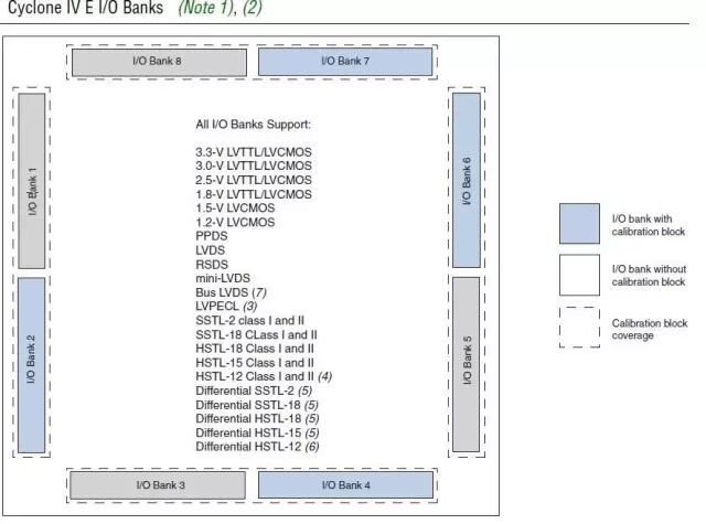 FPGA的IOE按组分类,每组都能够独立地支持不同的I/O标准,通过软件的灵活配置,可匹配不同的电器标准与IO物理特性,而且可以调整驱动电流的大小,可以改变上/下拉电阻,Cyclone IV设备有8个IO blank(组),见下图: