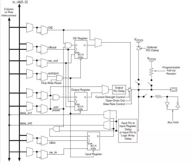2.1 IOEIOE是芯片与外部电路的物理接口,主要完成不同电气特性下输入/输出信号的驱动与匹配要求,比如从基本的LVTTL/LVCMOS接口到PCI/LVDS/RSDS甚至各种各样的差分接口,从5V兼容到3.3V/2.5V/1.8V/1.5V的电平接口,下面是ALTERA公司的Cyclone IV EP4CE115F29设备的IOE结构