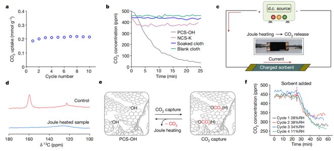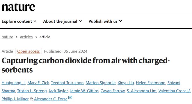 最终,相关论文以《用电荷吸附剂从空气中捕获二氧化碳》(Capturing carbon dioxide from air with charged-sorbents)为题发在 Nature[1]。