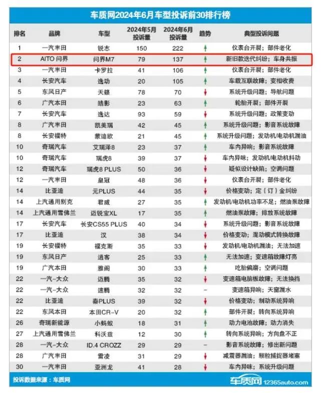 而且在6月份车质网的投诉排行榜上,问界M7还因新旧款迭代纠纷和车身共振问题而成为当月投诉排行榜第二位的存在。如何解决这些售后及问界M7销量下滑问题对赛力斯而言是相当大的考验。