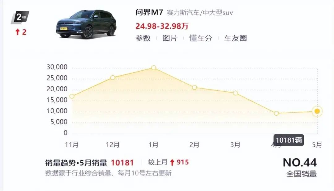 比如,尽管整体销量在上涨,但作为曾经问界的销量担当,问界M7(配置|询价)的销量在进入2024年后就呈现出下滑态势,今年5月份其销量仅有10181辆,和巅峰时期的动辄月销2万+甚至近3万台的成绩相比差距巨大。