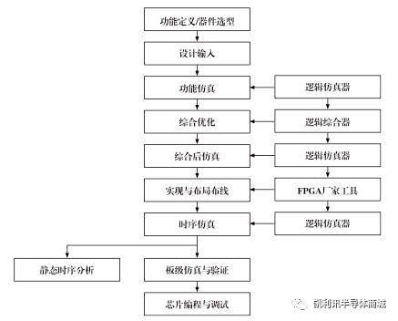 FPGA的设计流程就是利用EDA开发软件和编程工具对FPGA芯片进行开发的过程。典型FPGA的开发流程一般如图所示,包括功能定义/器件选型、设计输入、功能仿真、综合优化、综合后仿真、实现、布线后仿真、板级仿真以及芯片编程与调试等主要步骤。