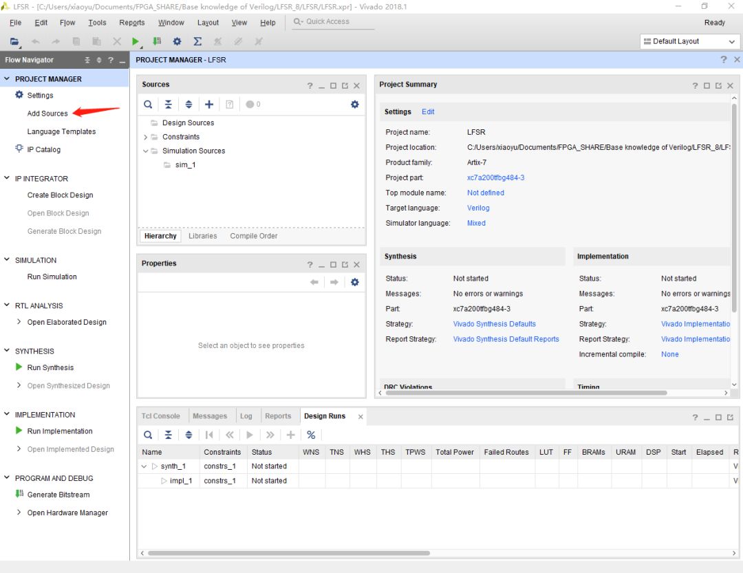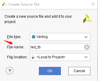 1. 添加testbench文件。在Flow Navigator界面下点击 Add Sources -> Add or create simulation sources -> Create File,则会出现如下界面,选定文件名(File name),文件类型(File type)。接下来依次点击OK,Finish, OK完成文件的创建。