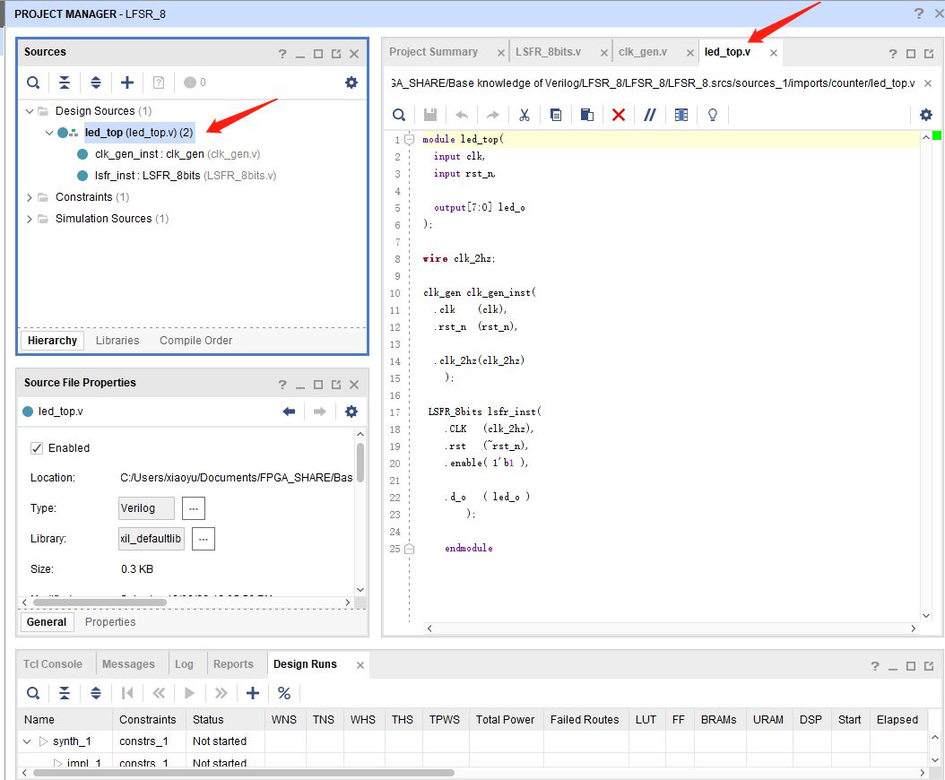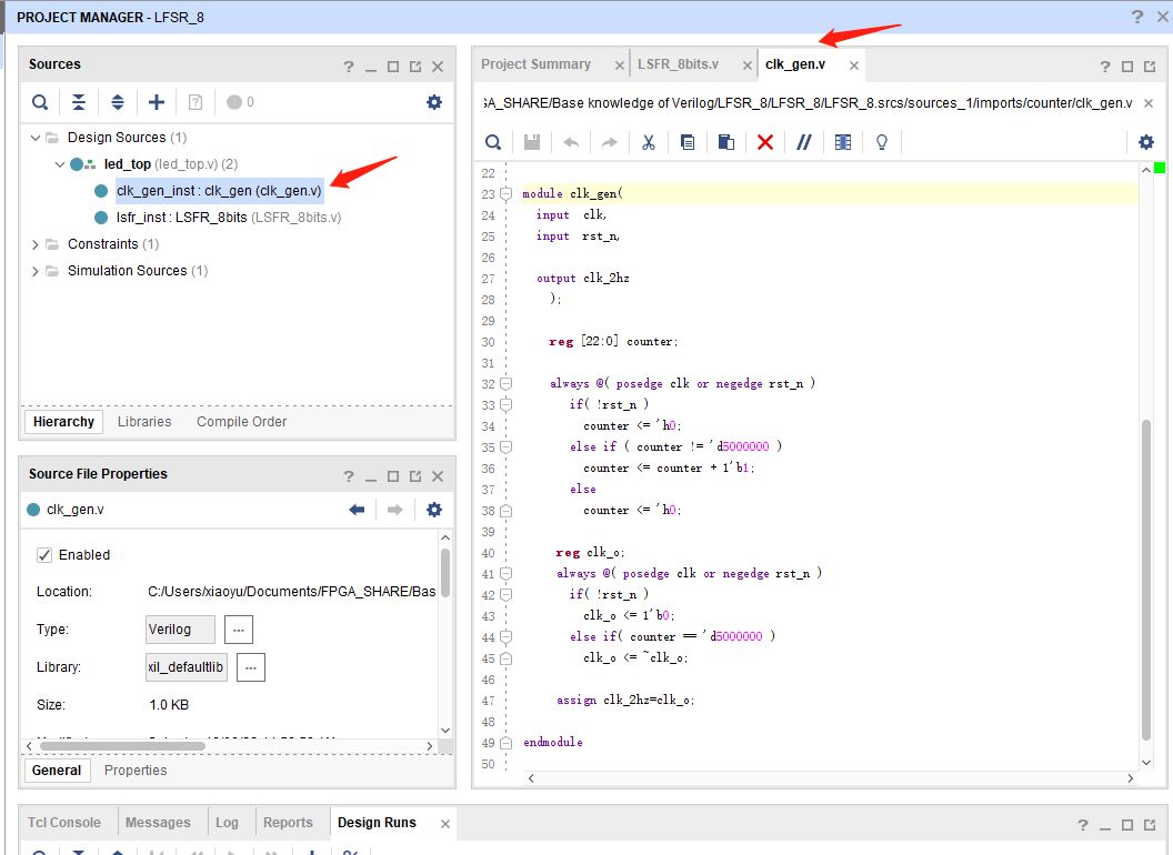 重复上述操作完成对clk_gen.v(分频模块)和led_top.v(顶层模块)文件的设计与编码。