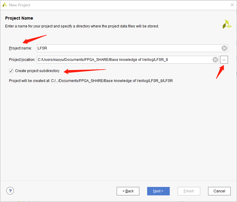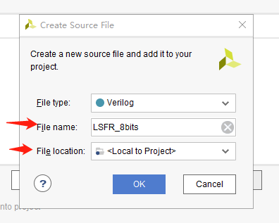 4. 指定文件名与路径(默认存放在工程默认路径),文件类型(File type)选择为Verilog,如果你用的是其它硬件描述语言,则选择你用的语言类型。