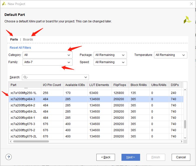 5. 选择器件或者板卡。Parts表示器件,当然如果是板卡就点击Boards。器件可以根据系列去选,也可以直接在Search栏搜索器件型号。器件的选择根据你的FPGA芯片来定,一般在你所用的开发板手册里面可以找到。选择完毕点击Next。