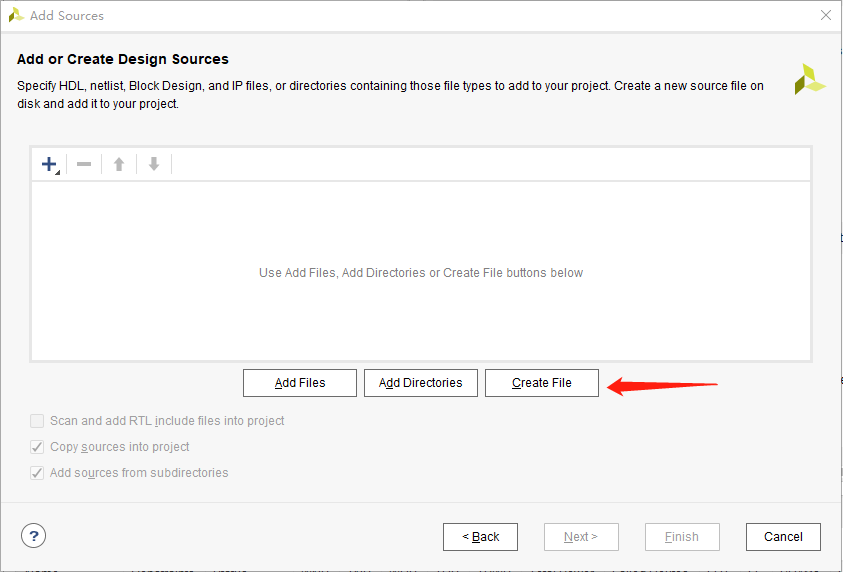 3. 这里点击Create File。Add Files表示添加已有的设计文件,Add Directories表示添加文件夹。