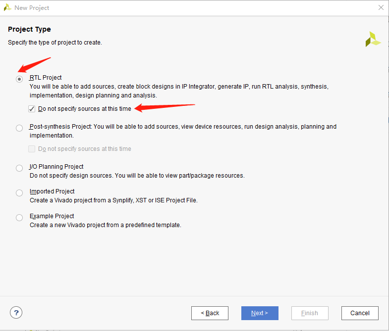 4. 选择RTL Project ,此时把Do not specify at this time勾上,表示在新建工程时不去指定源文件。