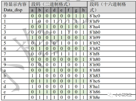 我们采用的是低电平点亮的共阳极数码管。首先看位选信号,SEL[0]对应开发板最右侧的数码管,以此类推。位选信号为1111_1111才能点亮数码管。再看段选信号,以显示0为例,需要将abcdef点亮,按照左边高位右边低位的顺序,dp、g、f、e、d、c、b、a就对应1100_0000。0-F对应(0)1100_0000、(1)1111_1001、(2)1010_0100、(3)1011_0000、(4)1001_1001、(5)1001_0010、(6)1000_0010、(7)1111_1000、(8)1000_0000、(9)1001_0000、(A)1000_1000、(B)1000_0011、(C)1100_0110、(D)1010_0001、(E)1000_0110、(F)1000_1110。