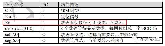 包括输入:时钟信号、复位信号,输出:段选信号和位选信号。这个模块最重要的是弄清楚怎么产生段选和位选信号。每隔0.5s,我们要实现00000000-FFFFFFFF的循环显示,那么位选信号我们之前探讨了必须为1111_1111才能使数码管正常工作,而段选信号我们也探讨了从0-F的段选信号,就可以画出波形图。根据波形图可以编写代码。