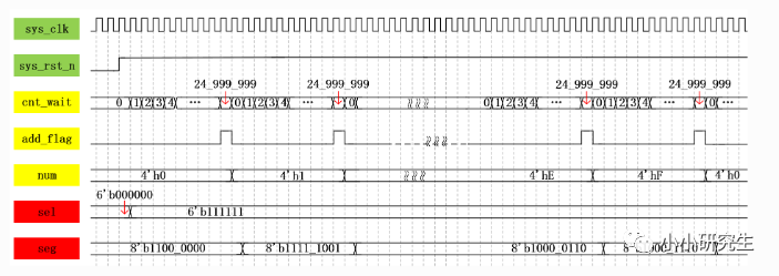 我们需要三个中间信号:计数器cnt_wait,标志信号add_flag,显示信号num。其中,cnt_wait从0计数到24999999即0.5s,每到计满时标志信号add_flag拉高,且显示信号跳转到下一个状态,显示信号需要从0-F循环。