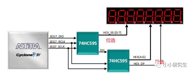 通过系统框图可以看出,分为3个模块:数码管驱动模块,芯片控制模块和数码管显示模块。数码管显示模块是顶层模块,实质上完成两个子模块的实例化。上图里整个系统连接方式是Cyclone IV E连接74HC595芯片连接数码管。我们看数码管驱动和芯片控制这两个子模块,下图中数码管的引脚图需要段选信号和位选信号去驱动,74HC595芯片,除了几个常接高低电平的引脚外,它的输入引脚是接Cyclone IV E的,输出引脚是控制数码管的。顶层模块中只需要考虑芯片和Cyclone IV E之间的连线,因此顶层模块的输入是时钟和复位信号,输出是芯片的输入引脚:寄存器时钟,存储器时钟,数据输入。尤其要注意的是,因为我用的开发板没有使能引脚,他不能作为输出存在。我们再将顶层模块拆分为数码管驱动模块和芯片控制模块。数码管驱动模块考虑数码管和芯片之间的连线,因此它的输入是时钟和复位信号,输出是段选和位选信号。芯片控制模块考虑的是芯片和数码管以及Cyclone IV E的连线,因此它的输入是时钟、复位、段选和位选信号,使能信号,输出是芯片的输入引脚(寄存器时钟,存储器时钟,数据输入)。理清楚了这些,就很容易编写代码了。