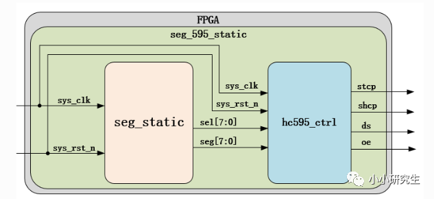 module seg_595_static(input wire sys_clk ,input wire sys_rst_n , output wire stcp , output wire shcp , output wire ds ); //wire define wire [7:0] sel; wire [7:0] seg; //---------- seg_static_inst ---------- seg_static seg_static_inst ( .sys_clk (sys_clk ), .sys_rst_n (sys_rst_n ), .sel (sel ), .seg (seg ) ); //---------- hc595_ctrl_inst ---------- hc595_ctrl hc595_ctrl_inst ( .sys_clk (sys_clk ), .sys_rst_n (sys_rst_n), .sel (sel ), .seg (seg ), .en(1b1), .stcp (stcp ), .shcp (shcp ), .ds (ds ) ); endmodule顶层模块实质是两个实例化。