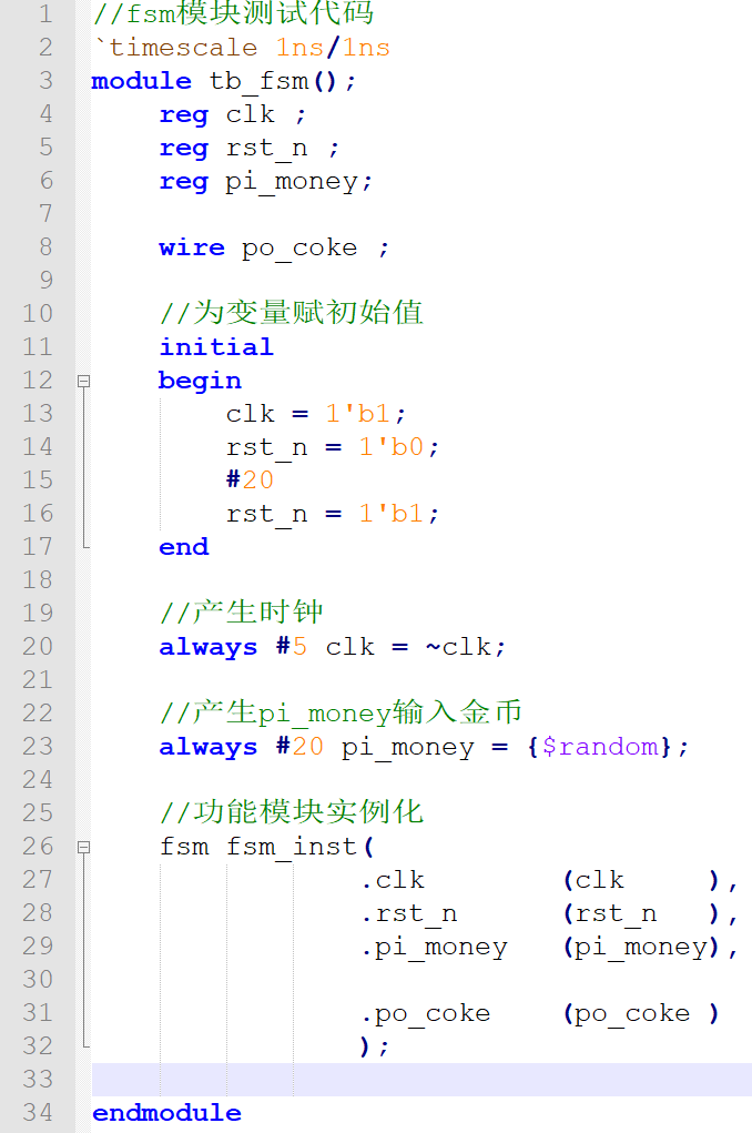 ⑦第 18 行将结构体 abc 与 state 关联, 若要到 state 需要从最顶层开始,此时最顶层为测试模块,在测试模块中功能模块被重新命名为 fsm_inst, 所以