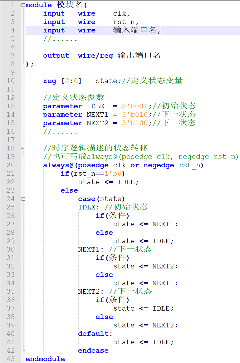 综上所述,采用两个时序逻辑 always 块,不仅可以描述清楚状态转移和数据输出,又能消除组合逻辑带来的毛刺。下面给出该状态机描述方法的模板。