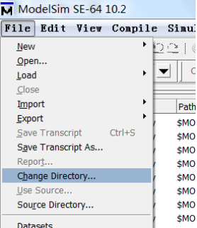 ①打开 modelsim,选择 File>>Change Directory…, 如图 7 所示, 找到 do 文件的路径;图 7 改变 modelsim 指向路径