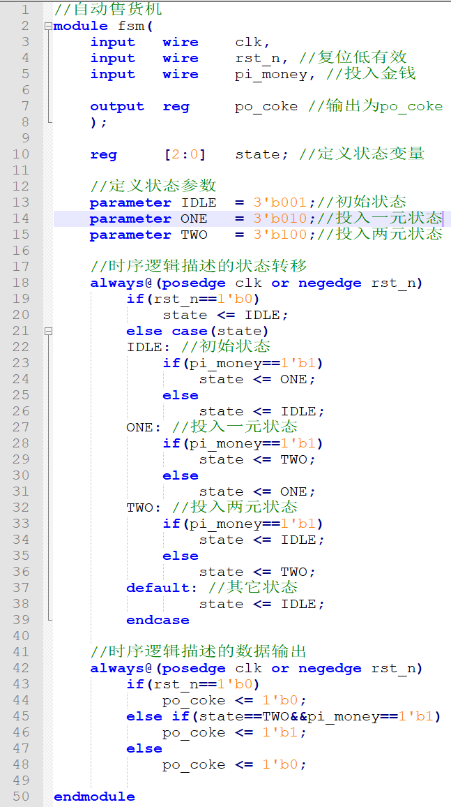 ①第 10 行定义状态变量, 由于此处有三个状态,并且使用独热码(onehot), 所以该状态变量位宽定义为 3 位。独热码指的是每一个数据只有一位是1, 其他位均为 0,由于独热码的变化只需要一位转变即可,所以使用独热码具有可以提高运行速度的优势;②第 13、 14、 15 行定义三个状态的参数, Verilog HDL 是区分字母的大小写的, 一般来说变量是由小写字母组成,为了便于与变量区分开, 我们可以将参数定义成大写;