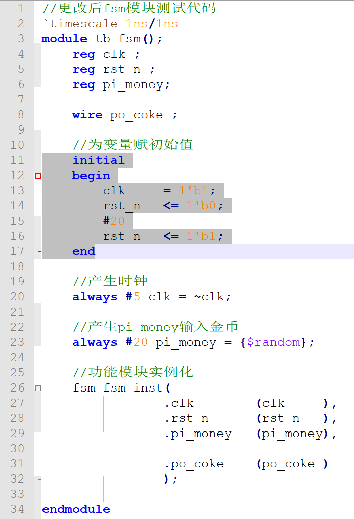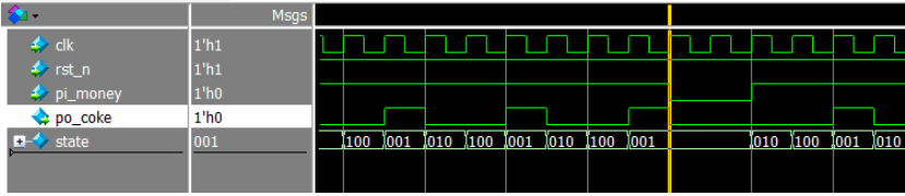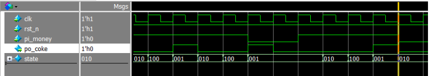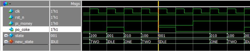 由图 5 中的黄线处看到, 该处 clk 的上升沿采到pi_money 为 1, state 在IDLE 状态(001), 但是状态却没有跳转到 ONE 状态(010), 造成此种结果的原因是测试代码写的有问题,为了得到寄存器的特性,我们在写测试代码时, 除了时钟(clk), 其他由 always 产生的变量均采用非阻塞赋值(<=)。更改后的测试代码如下: