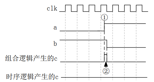 毛刺的产生对于数字系统设计的有效性和可靠性有严重的影响, 因此我们在设计数字电路时应该尽量避免毛刺的产生,而时序逻辑可以很好的消除毛刺,如图 2 所示,当我们使用时序逻辑时, c 的产生不仅跟 a 和 b 有关,还与clk 的沿有关系, 当 clk 的沿采集不到该毛刺时,则可以消掉该毛刺,而 clk 的沿采集到毛刺的概率极小。